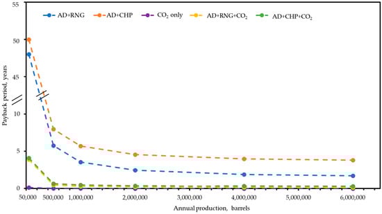 Annual income primarily comes from cost savings on natural gas, electricity, and CO2, as well as tax credits (see Table S3 for details). Figure 7 illustrates the payback period for different options. For an annual production of 50,000 barrels, the payback period is 43.0 years for AD with RNG and 45.4 years for AD with CHP. However, when considering the implementation of a CO2 recovery system, the payback period significantly decreases to 3.5 years for the combination of AD and RNG and 3.7 years for the combination of AD and CHP. Without CO2 recovery, both AD + RNG and AD + CHP become economically feasible for craft breweries with annual production >500,000 barrels, with a payback period of <10 years.