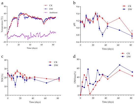 Evolution of temperature and physicochemical parameters during composting. Variations of temperature (a), pH (b), TOC (c), and OM-loss (d). CK: a natural fermentation group with 1‰ corn cob powder; DW: a treatment group with 1‰ cold-adapted microbial agents.