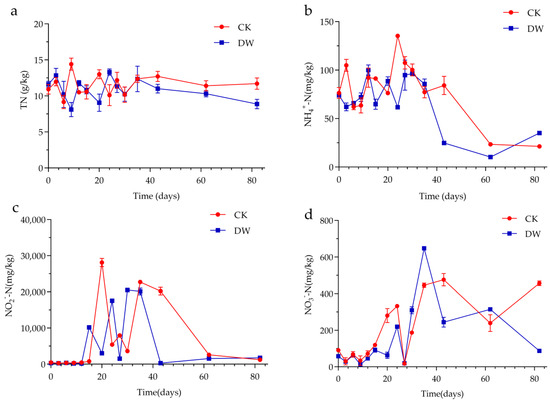 Total nitrogen (TN) is a key indicator of the quality of compost products. As shown in Figure 2a, TN levels in both experimental groups decreased rapidly at the start of composting due to the release of ammonia, followed by a brief upward trend due to the enrichment effect of reduced OM and a slow and sustained decrease in TN levels after 35 days. At the end of composting, TN increased by 7.1% in the CK group, indicating a relative enrichment of nitrogen, which was associated with a reduction in compost mass and the decomposition of OM. However, the DW group showed a 23.6% decrease in TN along with higher levels of NH4+–N. Although NO3−–N is also an important nutrient for plants, NO3−–N is easily lost through leaching or denitrification before it is used by plants. In the DW group, more N was retained in the compost, mainly in the form of NH4+–N, which can subsequently increase the efficiency of N use, which may be related to the addition of cold-tolerant microbial agents.