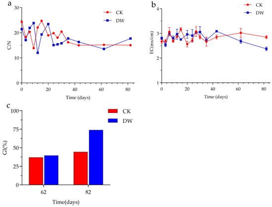 The C/N ratio is an important indicator of compost maturity and stability. As shown in Figure 3a, the changes in the C/N ratio during composting for both samples were similar to the loss of OM. Total N decreased due to ammonia emission before the first compost turn, and the C/N ratio then increased and gradually stabilized during compost maturity, with a similar trend to that reported by Zhang et al. [25]. EC was related to the concentration of water-soluble ionic salts in the compost. As shown in Figure 3b, the EC values of the CK and DW groups varied less during composting and were 2.85 ms/cm and 2.37 ms/cm, respectively, at the end of composting, which were lower than the recommended value of 4 ms/cm [26]. In contrast, the DW group had lower EC values than the initial values, probably due to more OM conversion. Higher EC values occurred during the thermophilic phase of composting, such as on days 27 and 43, probably due to the conversion of OM into nutrients and the increased concentration of water-soluble salts in the compost [27]. After the third turning of the compost, the EC values gradually decreased. This indicated that the compost was entering a stable maturity stage, and more OM was mineralized [28]. The seed germination index (GI) was measured on days 62 and 82 to determine the toxicity and maturity of the compost (Figure 3c). At day 62, the results showed that the GI of DW (37.0%) was not significantly different from that of CK (39.5%) (p > 0.05). At the end of the experiment, the GI of DW remained at around 73.9%, compared to 44.4% for CK. The addition of the bacterium effectively promoted the maturity of the compost after the third turning, and the final GI value was close to the recommended value.