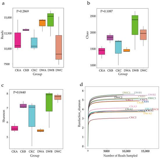 Alpha diversity indices of the microbial community. (a) Reads of sequences, (b) Chao index, (c) Shannon index, (d) Shannon rarefaction. CKA, DWA; CKB, DWB; CKC; DWC denote the initiation, thermophilic, and maturation stages of CK and DW group, respectively. The numbers behind the letters in subfigure (d) indicate three replicates of each sample. The difference in the diversity index among samples was analyzed by one-way ANOVA, with significant differences if p < 0.05.