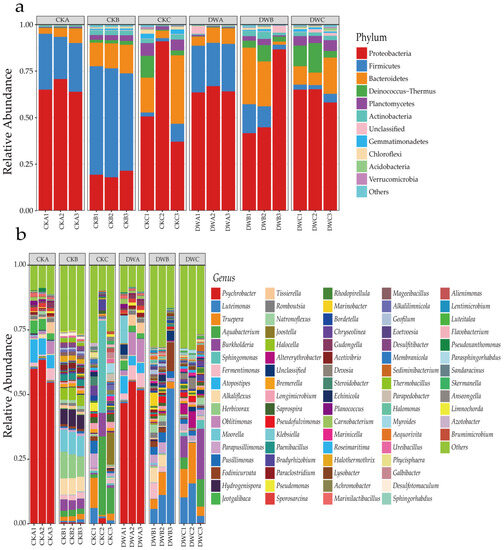 In Figure 5a, the dominant bacterial strains in all samples at different composting periods were Proteobacteria (18–91%), Firmicutes (2–59%), and Bacteroidetes (3–37%), a result similar to that of Zhang and Xu [30,31]. In the mesophilic, thermophilic, and maturation stages, Proteobacteria accounted for 67%, 20%, and 60% in the CK group and 65%, 58%, and 63% in the DW group, respectively.