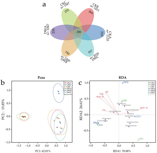 The differences in OTUs between the experimental groups were compared visually with a Venn diagram, as shown in Figure 6a, with a similarity of 98.65%. The total number of OTUs in the CK group was 1135 at the beginning of composting and increased to 1567 at the end of composting. In the DW group, they increased from 1067 to 2018, with a significantly higher increase in the number of OTUs than in the CK group (p < 0.05). At the beginning of composting, there was no significant difference in the number of specific OTUs between the CK and DW. During the thermophilic and maturation stages, the number of specific OTUs was significantly higher in the DW group than in the CK group (p < 0.05), indicating that inoculation with cold-adapted bacteria increased bacterial abundance and specific bacterial diversity in the compost. The PCoA based on the Bray–Curtis distance matrix is shown in Figure 6b. By comparing the relative distances between CK and DW samples at different stages, it was found that there was no significant difference between the bacterial communities of the two groups at the early stage of composting. The difference between the bacterial communities of the two groups reached its maximum after entering the thermophilic stage, and at the maturation stage of composting, the difference shrank but was still significant, indicating that the addition of cold-adapted microbial agents caused significant changes in the succession of bacterial communities in the compost. This may be due to the presence of Bacillus thuringiensis and Bacillus mycoides among the cold-adapted agents, which are less affected by compost temperatures than other bacteria. Bacillus is considered to be the main genus that controls changes in the abundance of other bacteria [35].
