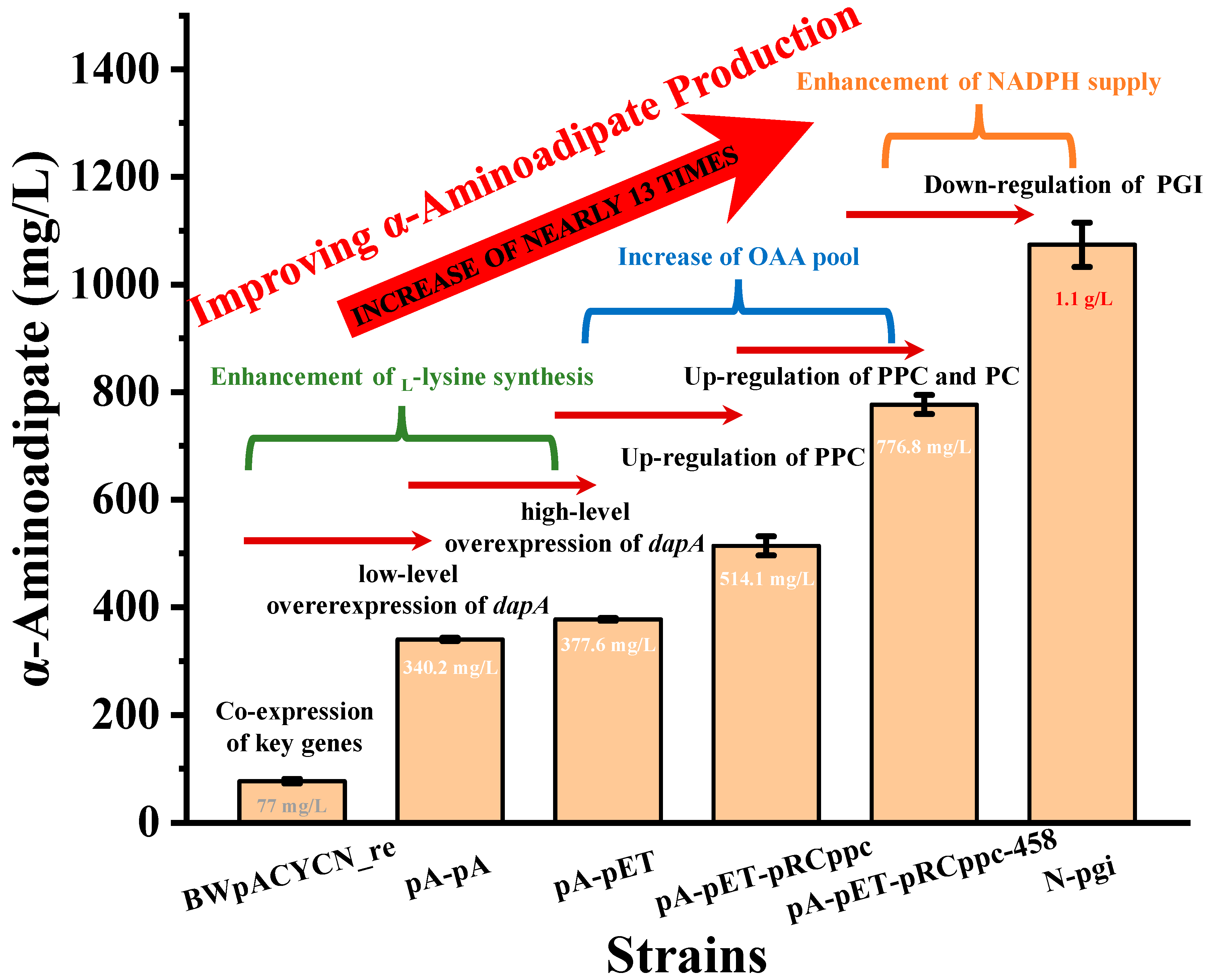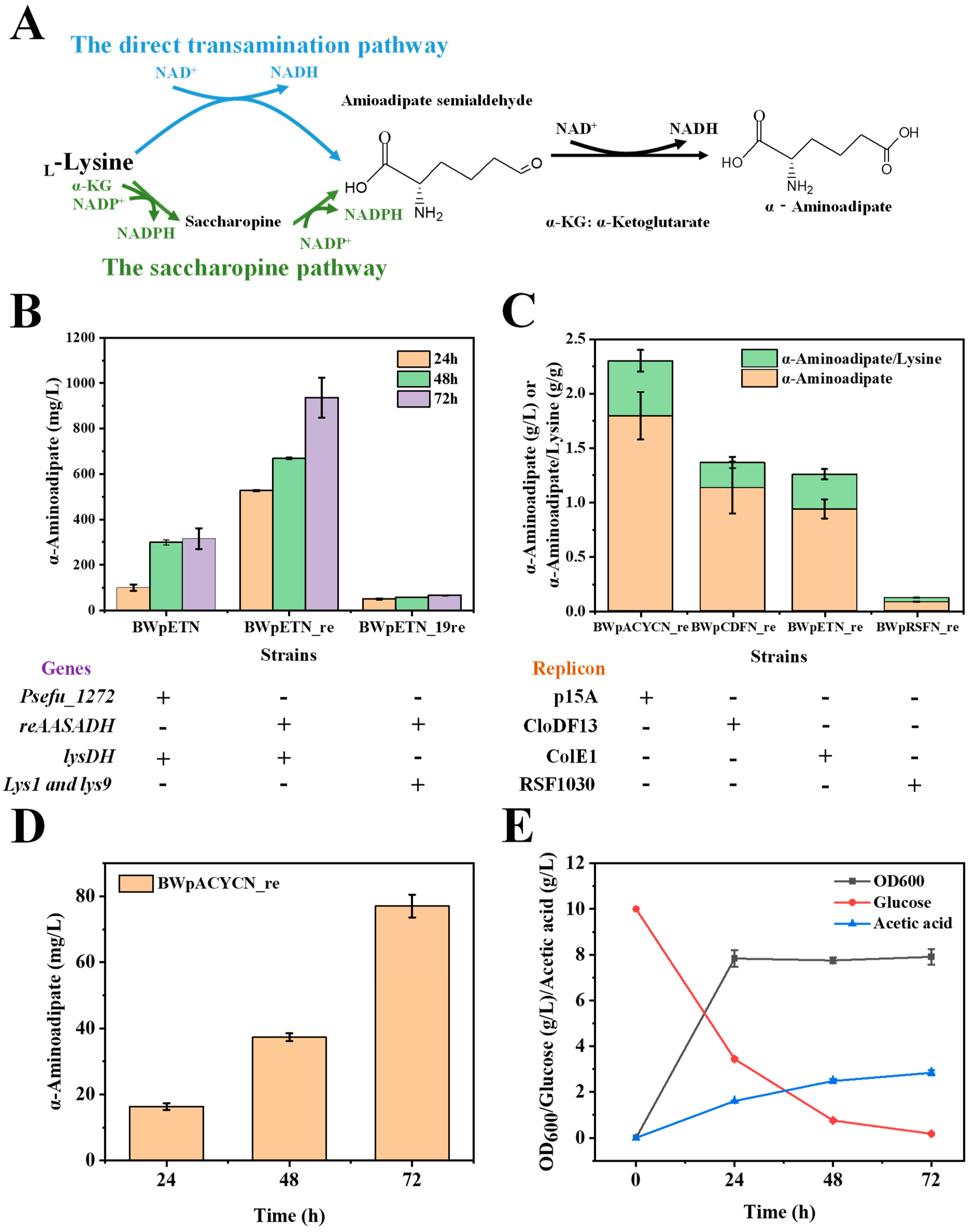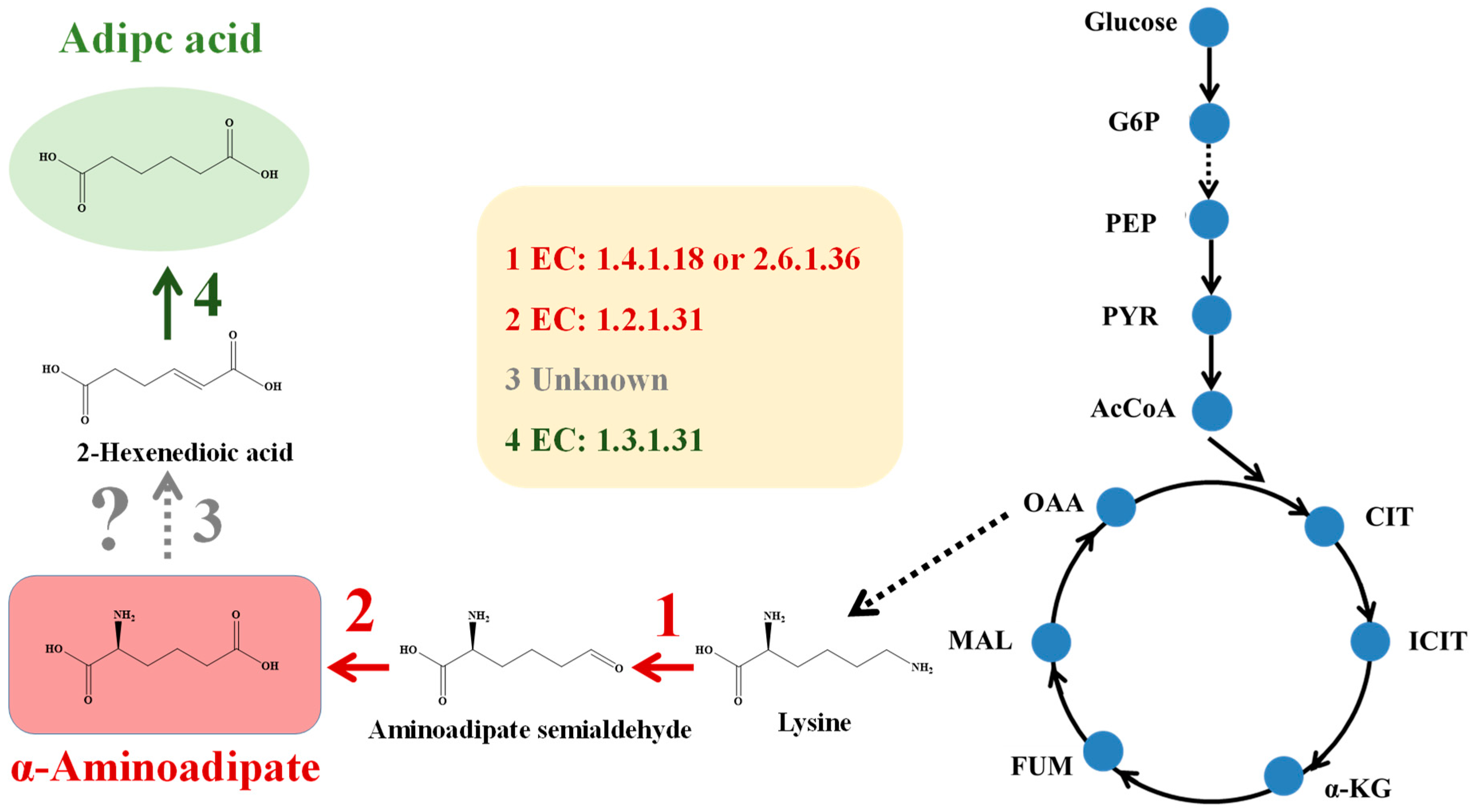 - Zhang, Y.; An, N.; Zhao, Y.; Li, X.; Shen, X.; Wang, J.; Sun, X.; Yuan, Q. Efficient biosynthesis of α-aminoadipic acid via lysine catabolism in Escherichia coli. Biotechnol. Bioeng. 2023, 120, 312–317. [Google Scholar] [CrossRef] [PubMed]