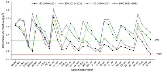 Soil moisture content during the crop growth period. I, irrigation; FC, field capacity; PWP, permanent wilting point.