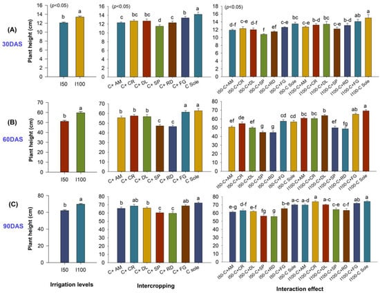 Plant height of chia in response to irrigation regime, intercropping, and their interaction effect at 30 DAS (A), 60 DAS (B), and 90 DAS (C). 50, 50% ETo; I100, 100% ETo; C + AM, chia + amaranthus; C + CR, chia + coriander; C + DL, chia + dill; C + SP, chia + spinach; C + RD, chia + radish; C + FG, chia + fenugreek; C Sole, chia monocrop. Type of test, analysis of variance (split plot design); number of replicates, 3; level of significance, p < 0.05; different letter in lower case above bar graph indicates significant difference among the treatments.