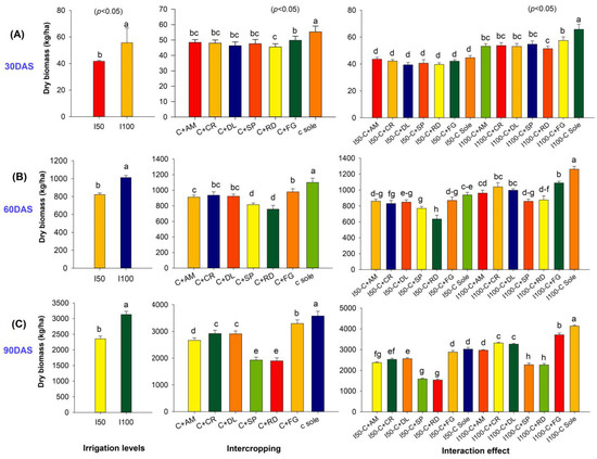 Biomass accumulation in chia as influenced by irrigation regime, intercropping, and their interaction effect at 30 DAS (A), 60 DAS (B), and 90 DAS (C). I50, 50% ETo; I100, 100% ETo; C + AM, chia + amaranthus; C + CR, chia + coriander; C + DL, chia + dill; C + SP, chia + spinach; C + RD, chia + radish; C + FG, chia + fenugreek; C Sole, chia monocrop. Type of test, analysis of variance (split plot design); number of replicates, 3; level of significance, p < 0.05; different letter in lower case above bar graph indicates significant difference among the treatments.