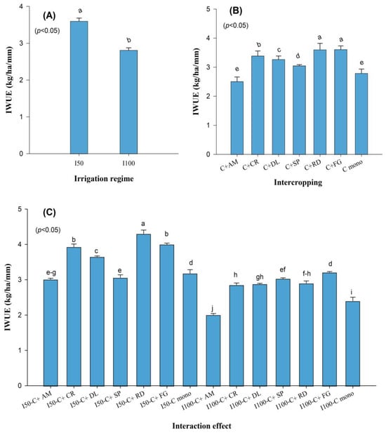 Irrigation water use efficiency (IWUE) for chia seed, oil, and α-linolenic acid (ALA) in response to irrigation regime (A), intercropping (B), and their interaction effect (C). I50, 50% ETo; I100, 100% ETo; C + AM, chia + amaranthus; C + CR, chia + coriander; C + DL, chia + dill; C + SP, chia + spinach; C + RD, chia + radish; C + FG, chia + fenugreek; C mono, chia monocrop. Type of test, analysis of variance (split plot design); number of replicates, 3; level of significance, p < 0.05; different letter in lower case above bar graph indicates significant difference among the treatments.
