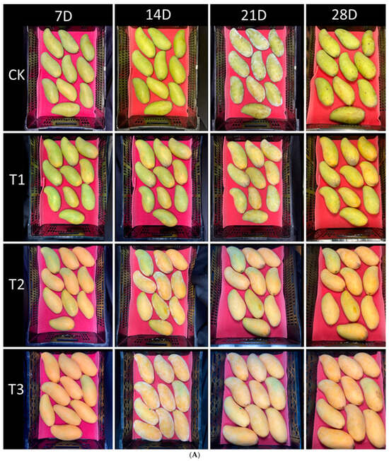 3.1. Changes in Different Treatments on the Appearance of Mango Fruits