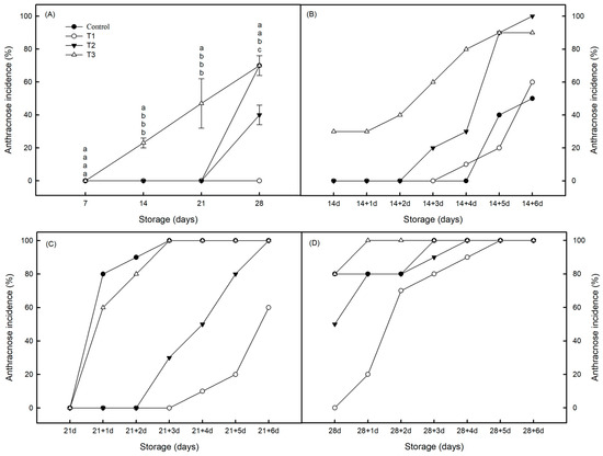 Effects of post-ripening time on the anthracnose incidence of post-harvest Jin Huang mango. (A) Storage at 4 °C; (B) storage at 4 °C for 14 days with rewarming (20 °C) for 6 days; (C) storage at 4 °C for 21 days with rewarming (20 °C) for 6 days; (D) storage at 4 °C for 28 days with rewarming (20 °C) for 6 days. The control group (CK; ●) was without any treatment; the T1 group (○) was ripened with 500 ppm ethylene at 20 °C for 1 day; the T2 group (▼) was ripened with 500 ppm ethylene at 20 °C for 1 day and ripened at 20 °C for 1 day; the T3 group (△) was ripened with 500 ppm ethylene at 20 °C for 1 day and ripened at 20 °C for 2 days. The vertical bar represents the standard errors of the mean. Values with different letters indicate significant differences (p < 0.05).