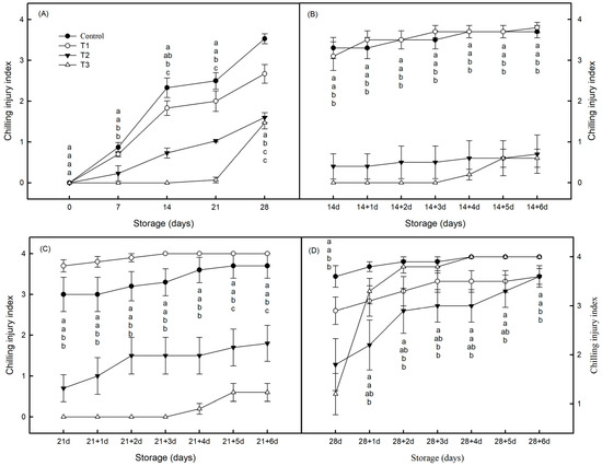 Effects of post-ripening time on the chilling injury index of post-harvest Jin Huang mango. (A) Storage at 4 °C; (B) storage at 4 °C for 14 days with rewarming (20 °C) for 6 days; (C) storage at 4 °C for 21 days with rewarming (20 °C) for 6 days; (D) storage at 4 °C for 28 days with rewarming (20 °C) for 6 days. The control group (CK; ●) was without any treatment; the T1 group (○) was ripened with 500 ppm ethylene at 20 °C for 1 day; the T2 group (▼) was ripened with 500 ppm ethylene at 20 °C for 1 day and ripened at 20 °C for 1 day; the T3 group (△) was ripened with 500 ppm ethylene at 20 °C for 1 day and ripened at 20 °C for 2 days. The vertical bar represents the standard errors of the mean. Values with different letters indicate significant differences (p < 0.05).