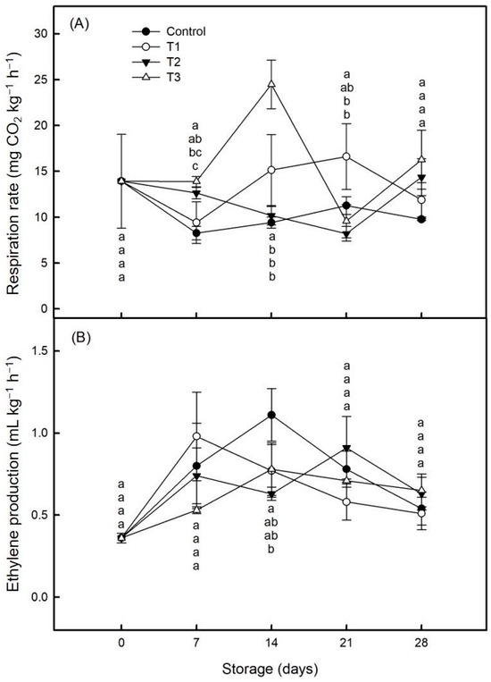 Effects of the post-ripening period on (A) respiration rate and (B) ethylene production of Jin Huang mango during storage at 4 °C. The control group (CK; ●) was without any treatment; the T1 group (○) was ripened with 500 ppm ethylene at 20 °C for 1 day; the T2 group (▼) was ripened with 500 ppm ethylene at 20 °C for 1 day and ripened at 20 °C for 1 day; the T3 group (△) was ripened with 500 ppm ethylene at 20 °C for 1 day and ripened at 20 °C for 2 days. The vertical bar represents the standard errors of the mean. Values with different letters indicate significant differences (p < 0.05).