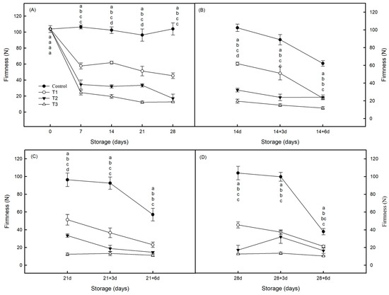 Effects of post-ripening time on the firmness of post-harvest Jin Huang mango. (A) Storage at 4 °C; (B) storage at 4 °C for 14 days with rewarming (20 °C) for 6 days; (C) storage at 4 °C for 21 days with rewarming (20 °C) for 6 days; (D) storage at 4 °C for 28 days with rewarming (20 °C) for 6 days. The control group (CK; ●) was without any treatment; the T1 group (○) was ripened with 500 ppm ethylene at 20 °C for 1 day; the T2 group (▼) was ripened with 500 ppm ethylene at 20 °C for 1 day and ripened at 20 °C for 1 day; the T3 group (△) was ripened with 500 ppm ethylene at 20 °C for 1 day and ripened at 20 °C for 2 days. The vertical bar represents the standard errors of the mean. Values with different letters indicate significant differences (p < 0.05).