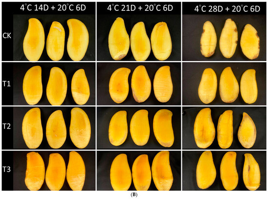 The effects of the post-ripening period on pulps appearance of post-harvest Jin Huang mangoes (A) stored at 4 °C for 14, 21, and 28 days; (B) followed by stored at 20 °C for 6 days. The control group (CK) was without any treatment; the T1 group was ripened with 500 ppm ethylene at 20 °C for 1 day; the T2 group was ripened with 500 ppm ethylene at 20 °C for 1 day and ripened at 20 °C for 1 day; the T3 group was ripened with 500 ppm ethylene at 20 °C for 1 day and ripened at 20 °C for 2 days.