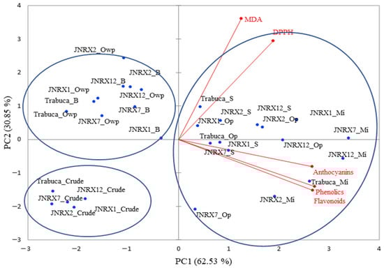 In order to establish a descriptive model of the grouping genotypes according to their bioactive compounds and thermal processing, principal component analysis (PCA) was applied to the data on the composition (phenolics, flavonoids, anthocyanins, and antioxidant activity—DPPH and MDA) of the purple-fleshed sweet potato genotypes. The PCA of purple-fleshed sweet potato genotypes explained 93.38% of the dataset’s variability. All genotypes, both in natura and oven-processed without packaging (grouped in PC1−) showed the smallest contents of bioactive compounds (Figure 2; Table 1), as well as the lowest values of activity against the radical DPPH. The ‘JNRX2’ and ‘Trabuca’ genotypes showed higher MDA values when cooked in an oven without packaging and were also the ones with the lowest contents of phenolics, flavonoids, and anthocyanins. With the exception of ‘JNRX7’, the other genotypes, when boiled, also showed values of total phenolics, flavonoids, and anthocyanins similar to those found when baked in an oven without packaging (PC1− and PC2+).