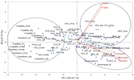 The PCA applied to the contents of the phenolic compounds, flavonoids, carotenoids, and antioxidant activity (DPPH and MDA) of the orange-, yellow-, and white-pulp genotypes explained 77.89% of the total variance of the data. The ‘LLR15’, ‘3513’, ‘2603’, and ‘Beauregard’ orange-pulp genotypes were grouped in PC1+, showing the highest carotenoid contents after thermal processing, reflecting their high antioxidant activity, detected via the DPPH assay (Figure 3; Table 1).