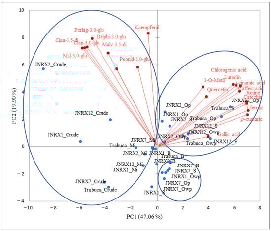 When PCA was applied to the dataset of the purple-fleshed sweet potatoes’ phenolic compounds, PC1 and PC2 summed up 66,96% of the total variance of the data (Figure 4). A greater similarity was noted between the genotypes’ phenolic composition with respect to the sample grouping resulting from the heat treatments. A clustering of the raw and cooked-in-microwave genotypes was identified in PC1−, apparently related to their anthocyanin contents. Cooking ‘JNRX2’, ‘JNRX12’, and ‘Trabuca’ sweet potatoes caused them to be grouped into PC1+/PC2+ due to their phenolic acid and flavonol concentrations. Genetic variability may influence different responses regarding the availability of phenolic compounds after cooking, including phenolic acids that are found in their free forms in vacuoles and apoplasts [].