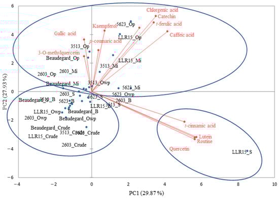 Two-dimensional projection and phenolic compound profile scores of the raw and heat-treated purple-fleshed sweet potato genotypes. Mi = microwave; S = steam; B = boil; Op = oven with aluminum foil protection; Owp = oven without protection.