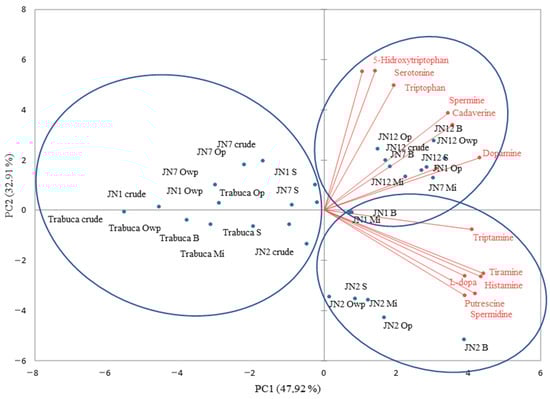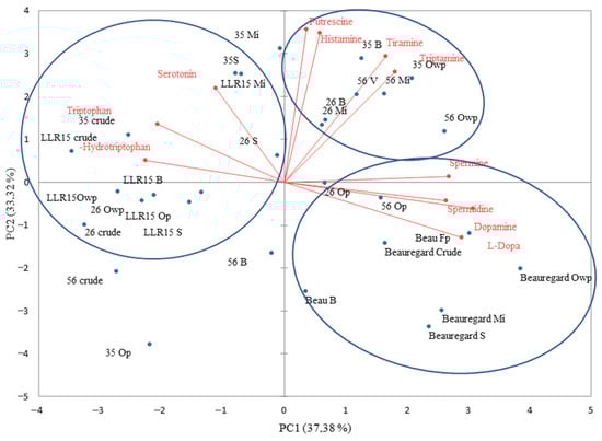 Applying PCA to the dataset of biogenic amines and amino acids of the orange-fleshed sweet potato genotypes revealed that PC1 and PC2 summed up 71.12% of the data’s variance (Figure 6). The ‘Beauregard’ sweet potato’s treatments were grouped in PC1+/PC2− due to their amounts of the amines spermine, spermidine, and dopamine, as well as the amino acid L-dopa. The ‘3513’, ‘2606’, and ‘5623’ genotypes were clustered in PC1+/PC2+ because of their putrescine and histamine levels after cooking treatments. In turn, the ‘LLR15’ genotype samples were grouped in PC2−, as they showed higher contents of tryptophan, 5-hydroxytryptophan, and the amine serotonin. In sweet potatoes, about 40.7% of the protein is formed from essential amino acids for human beings, including tryptophan [].