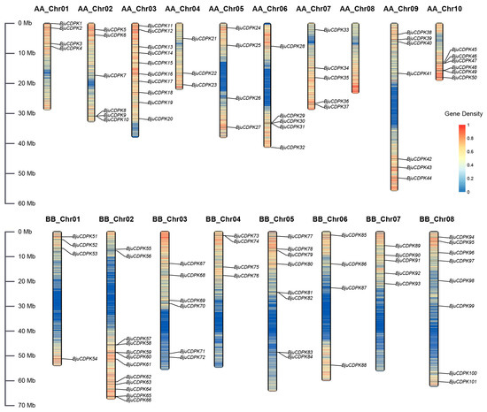 In this study, the Hidden Markov Model (HMM) profiles of the Pkinase domain (PF00069) and EF-hand 7 domain (PF13499) were used to characterize putative CDPK proteins. A total of 101 candidate CDPK genes were identified in the Brassica juncea genome (Braju_tum_V2.0). The physicochemical properties of their encoded proteins were analyzed based on their putative amino acid sequences (Table S2). These CDPK genes were designated as BjuCDPK1 to BjuCDPK101 based on their chromosome localization (Figure 1 and Table S2). The Gene Location Visualize of TBtools was used to construct a chromosomal location map. The results showed that the 101 BjuCDPK genes were unevenly distributed on all chromosomes except for AA_Chr08 (Figure 1). Among them, 12 BjuCDPK genes were detected on BB_Chr02, 10 on AA_Chr03, eight each on of BB_Chr05 and BB_Chr08, seven on AA_Chr09, six each on of AA_Chr02, AA_Chr10, and BB_Chr03, five on each of AA_Chr06, AA_Chr07, and BB_Chr07, four each on of AA_Chr01, AA_Chr05, BB_Chr01, BB_Chr04, and BB_Chr06, and three on AA_Chr04 (Figure 1).