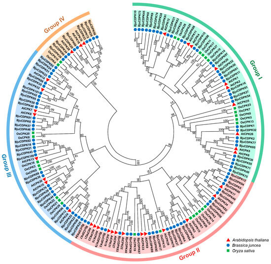 Phylogenetic analysis of the CDPKs in Arabidopsis thaliana, rice (Oryza sativa), and mustard (Brassica juncea). The percentage of replicate trees in which the associated taxa clustered together is shown next to the branch. A total of 165 CDPKs were classified into four distinct groups (Group I to IV) based on their protein sequence structural characteristics. The red triangles, blue cycles, and green squares represent AtCPKs in Arabidopsis, OsCPKs in rice, and BjuCDPKs in mustard, respectively.