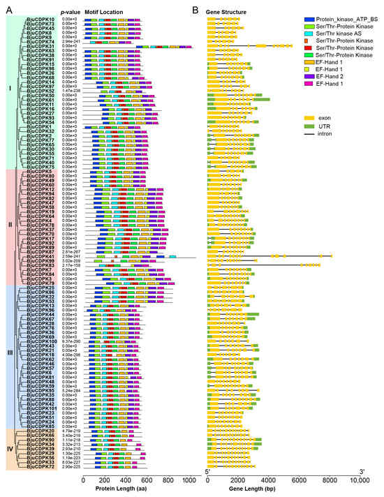 Conserved motifs and structure of encoding genes of BjuCDPKs. (A) Motif composition and distribution of 101 BjuCDPK proteins based on the phylogenetic relationship analysis by using Clustal Omega webtools with default parameters. The branch lengths in the phylogenetic tree represent the similarity between sequences. The roman numerals (I, II, III, and IV) represent four distinct groups of 101 BjuCDPK proteins base on the phylogenetic analysis. Ten motifs are indicated by different colors. The lengths of the boxes and lines are proportional to protein lengths. (B) Structure analysis of BjuCDPKs sequences. Exons are indicted by green and yellow boxes, respectively, and introns are shown by black lines. The lengths of the boxes and lines are proportional to gene lengths.