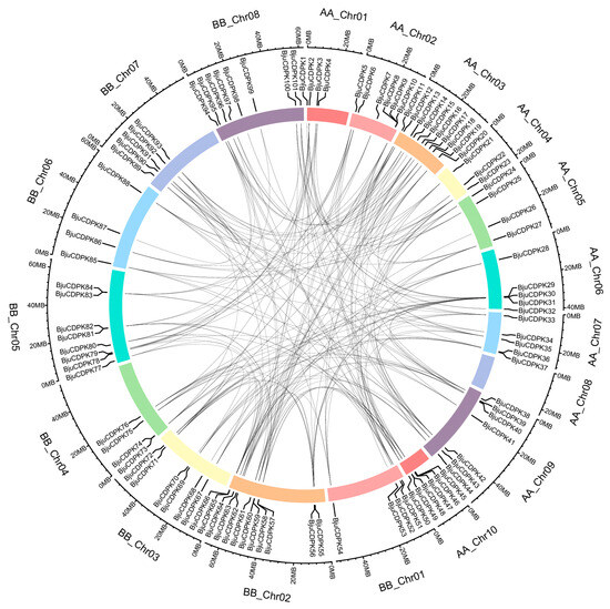 Synteny analysis of interchromosomal relationships of BjuCDPK genes. BjuCDPK gene pairs in the B. juncea genome are indicated by black lines. The different colors on the ring are used to distinguish different chromosomes.