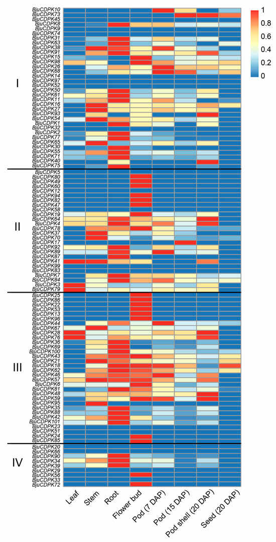 Expression patterns of 101 BjuCDPK genes in the leaf, stem, root, flower bud, and pod at different developmental stages. The relative expression levels were determined by RNA-seq data and normalized to 0–1. The roman numerals (I, II, III, and IV) represent four distinct groups of 101 BjuCDPK proteins base on the phylogenetic analysis described previously.