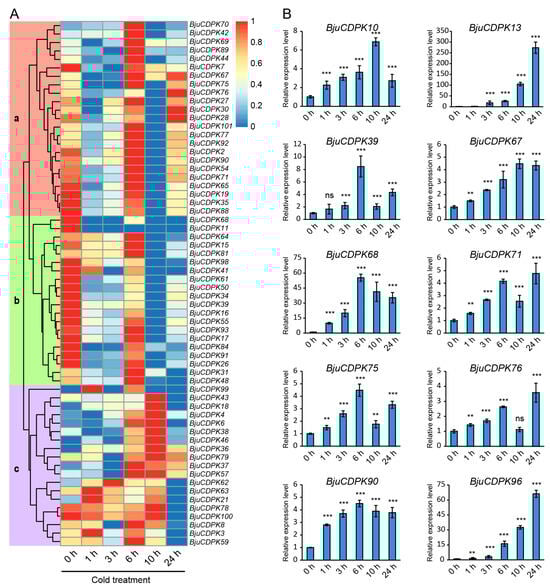 Expression patterns of BjuCDPK genes under cold stress. (A) Heatmap of expression profiles of BjuCDPK genes in seedlings under cold (4 °C) treatment, and the TPM value for each gene was normalized to 0–1. The cluster analysis of gene expression was assessed using the ‘complete’ linkage method in R package ‘pheatmap’. The lowercase letters (a, b, and c) represent three distinct groups of 62 BjuCDPK genes based on the expression analysis. (B) qRT-PCR validation of ten selected BjuCDPK genes under cold stress. *** indicates p < 0.001, ** indicates p < 0.01, and ns indicates ‘no significance’, as determined by one-way analysis of variance (ANOVA) with the corresponding sample compared to the 0 h reference.