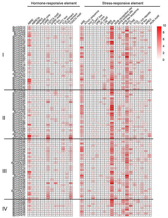 Numbers of 12 types of hormone-responsive elements and 19 types of stress-responsive elements in BjuCDPK gene promoter regions. The roman numerals (I, II, III, and IV) represent four distinct groups of 101 BjuCDPK proteins base on the phylogenetic analysis described previously.