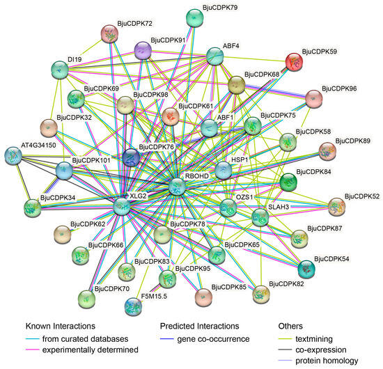 Protein–protein interaction network analysis for all 101 BjuCDPK protein sequences was performed by the STRING online tool (https://string-db.org/ accessed on 12 December 2022). The orthologs of Arabidopsis were selected as the reference.