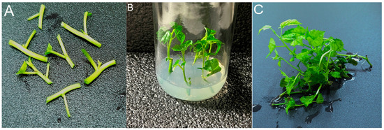 Shoots that formed from axillary buds after four weeks of cultivation at the in vitro induction stage were transferred to a multiplication medium. The shoots were then cut into single-node explants, and the leaves were partially removed (Figure 1A).