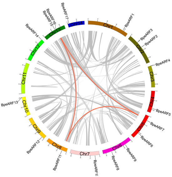 Chromosome distribution and gene duplication of BpeARF gene family. Each gene was mapped to the chromosome based on its physical location. The red lines emphasized collinear pairs of BpeARF genes, while the gray lines indicated collinear blocks of B. pendula genes.