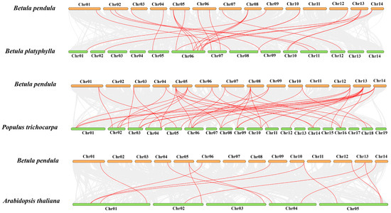 Synteny relationships of the ARF genes between B. pendula and three other plant species. The red lines emphasized the syntenic ARF gene pairs, and the gray lines indicated the collinear blocks within B. pendula and other plant genomes.