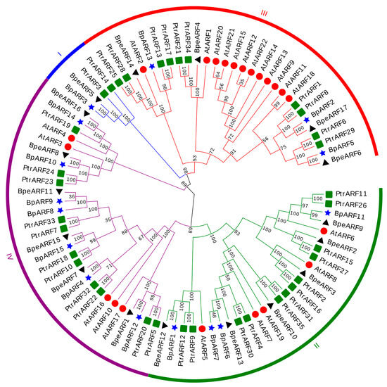 Phylogenetic relationship and classification ARF genes from B. pendula, B. platyphylla, P. trichocarpa, and A. thaliana. All ARF genes were classified into four classes with different colors. Four plant species were indicated by distinct symbols, respectively. Triangle, B. pendula; star, B. platyphylla; square, P. trichocarpa; round, A. thaliana. Bootstrap values were indicated by different numbers.