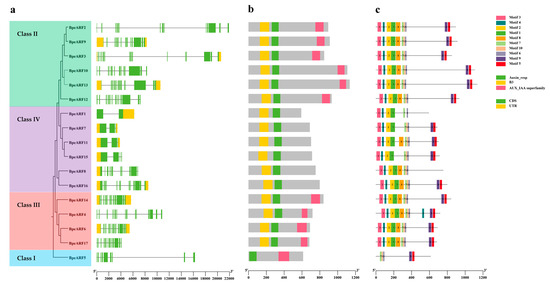To understand the structural components of the BpeARF genes, the exons and introns of the BpeARF genes were obtained by comparison with the corresponding genomic DNA sequences (Figure 4a). Gene structural analysis provided further evidence to support the phylogeny and classification of BpeARF gene family. A similar ARF classification pattern to the phylogenetic tree was observed, with BpeARFs clustering into four classes according to their gene structure. The results suggested that the numbers of introns and exons of BpeARF genes ranged from 1 to 14 and 2 to 15 across the four classes, respectively. BpeARF5 in Class I had nine exons and eight introns, Class II contained 13–14 exons and 12–13 introns, Class III had 14–15 exons and 13–14 introns, and Class IV contained 2–12 exons and 1–11 introns, indicating that the gene structure was somewhat differentiated in different classes, whereas they were conserved among the BpeARF genes within a class.