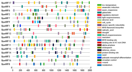 The gene expression is regulated by transcription factors through binding to the specific cis-acting elements. To identify the cis-acting elements of BpeARFs, the 2000 bp upstream sequence of each BpeARF gene was analyzed via the PlantCARE database (Figure 5). The results indicated that a total of 320 cis-acting elements was contained in 17 BpeARF genes, and most cis-acting elements were related to environmental factors and plant hormones. As the most abundant element, light responsiveness was identified in all BpeARF genes. Moreover, the elements involved in low temperature, drought, and defense stress also existed in promoter regions, and only BpeARF10 contained wound-responsive elements. As elements related to plant hormones, auxin-, gibberellin-, abscisic acid-, salicylic acid-, and methyl jasmonate (MeJA)-responsive elements were common in promoters, and all the BpeARF genes contained these elements except BpeARF9. A total of 17 elements corresponding to development was found in BpeARF promoters, which was involved in meristem, endosperm, seed, and palisade mesophyll differentiation. Additionally, the elements responding to binding site of AT-rich DNA, protein, and MYB transcription factor were also found in BpeARF3, -5, -6, -7, -8, -9, -10, -11, -12, and -15 promoter regions. In a word, the diversity of cis-acting elements suggested that BpeARF genes might participate in some biological processes, such as tissue development, hormone response, and defense stress.
