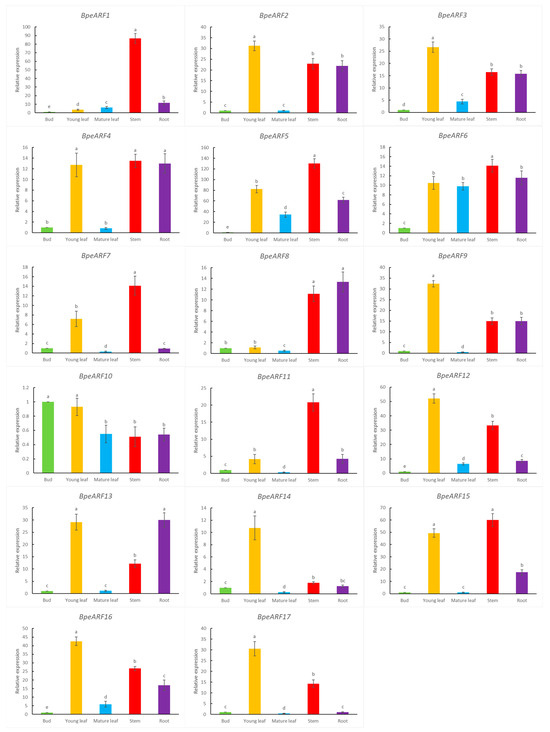 Expression patterns of BpeARF genes in different tissues of B. pendula. The comparison of means was analyzed by Duncan test. Different lower-case letters indicated significantly differences at 0.05 levels. The error bar meant standard deviation.