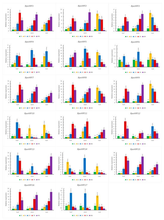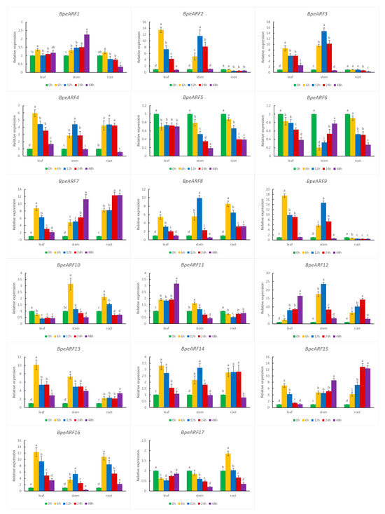 According to cis-acting element data, all the BpeARF genes contained at least one cis-element related to abiotic stress in their promoters. The expression levels of 17 BpeARF genes under drought stress were investigated by qRT-PCR (Figure 8). The results showed that 17 BpeARF genes expressions were highly diverse in different tissues. For instance, most of BpeARF genes (BpeARF1, -2, -3, -4, -7, -8, -9, -13, -14, -15, and -16) exhibited the highest expression at 6 h in leaves, and the expression levels of eight BpeARF genes (BpeARF2, -3, -4, -8, -9, -12, -14, and -16) peaked at 12 h in stems. BpeARF7 and BpeARF15 were upregulated in stems and roots. BpeARF5 and BpeARF6 were downregulated in leaves, stems, and roots, and BpeARF17 was downregulated in leaves and stems. The qRT-PCR results demonstrated that BpeARF genes played different roles in response to drought stress.