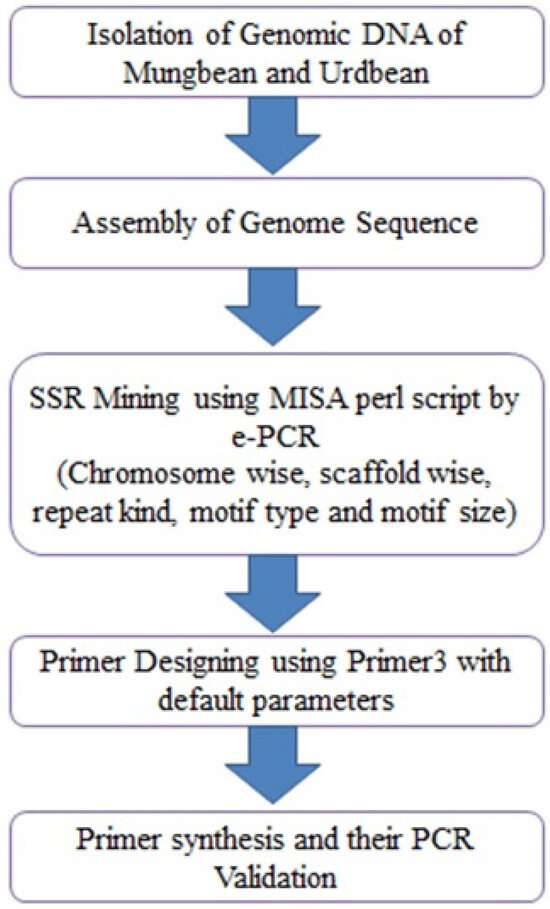 SSR markers are particularly popular in laboratories with limited resources [19]. The general methodology of SSR development consists of three steps, i.e., the preparation of an SSR library, PCR, and sequencing. This process is very laborious and expensive. To date, several workers [8,20,21,22,23,24,25,26,27,28] have developed SSR markers, but still, limited SSR markers are available in mungbean. This has further limited the molecular mapping of many desirable characteristics of stress resistance in the crop. Trait-based mapping is urgently required for mungbean to strengthen the molecular-marker-based improvement program. With the help of next-generation sequencing (NGS) technologies, it has become possible to develop and identify large numbers of SSRs and other markers at low prices. NGS technologies, coupled with bioinformatics approaches, can massively increase the number of SSRs available for carrying out genetic investigations in understudied and economically important crops such as mungbean. The whole-genome sequences of mungbean and urdbean varieties (ML 267 and Mash 114) were assembled at Punjab Agricultural University (PAU), Ludhiana, and an aggregate of 443,867 SSR markers were discovered in V. radiata (cv. ML267) and V. mungo (cv. Mash 114), of which 410,282 were found to be polymorphic in silico.