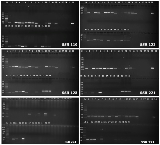 PCR profiles of WGS-based SSR markers in different Vigna accessions. M (Marker—100 bp); (1) V. umbellata (cultivated); (2) V. umbellata (cultivated); (3) V. umbellata; (4) V. sublobata; (5) V. sublobata; (6) V. trilobata; (7) V. trilobata; (8) V. trilobata; (9) V. trilobata; (10) V. aconitifolia; (11) V. aconitifolia; (12) V. aconitifolia (TMV-1); (13) V. stipulacea; (14) V. stipulacea; (15) V. radiata var. radiata; (16) V. radiata var. mungo; (17) V. radiate var. mungo; (18) V. radiate var. mungo; (19) V. slyestris; (20) V. glabrescence; (21) V. radiata var. satulosa; (22) V. vexillata; (23) V. hainiana; (24) V. dalzelliana; (25) V. unguiculata; (26–33) Cajanus and Glycine spp.