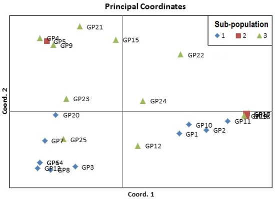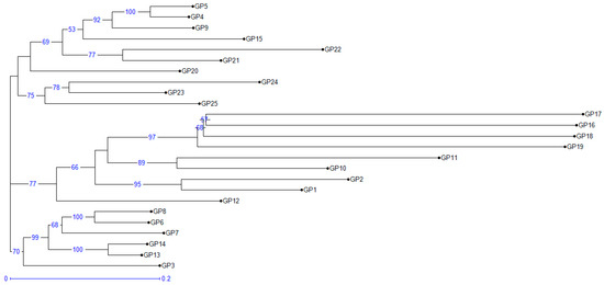 The Vigna accessions were clustered into three main clusters based upon genetic dissimilarity, which was estimated using an unweighted pair group method with an arithmetic mean (UPGMA) neighbor-joining approach (Table 4 and Figure 3). Cluster 1 consists of 10 Vigna accessions, which were further divided into two major sub-clusters (sub-cluster 1a and sub-cluster 1b). Sub-cluster 1a included seven accessions (GP5 (V. sublobata), GP4 (V. sublobata), GP9 (V. trilobata), GP15 (V. radiata var. radiata), GP22 (V. vexillata), GP21 (V. radiata var. setulosa), and GP20 (V. glabrescence)), while sub-cluster 1b comprised three accessions (GP24 (V. dalzelliana), GP23 (V. hainiana), and GP25 (V. unguiculata)). The second cluster comprised nine accessions, with eight (GP17 (V. radiata var. mungo), GP16 (V. radiata var. mungo), GP18 (V. radiata var. mungo), GP19 (V. slyestris), GP11 (V. aconitifolia), GP10 (V. aconitifolia), GP2 (V. umbellata cultivated), and GP1 (V. umbellata cultivated)) and one accession (GP12) in sub-clusters 2a and 2b, respectively. The third cluster consisted of six accessions grouped into two sub-clusters, namely, 3a with five accessions (GP8 (V. trilobata), GP6 (V. trilobata), GP7 (V. trilobata), GP14 (V. stipulacea), and GP13 (V. stipulacea)) and 3b with one accession (GP3 V. umbellata). Nei’s unbiased genetic distance (GD) and genetic identity (GI) were also estimated, and based on the genetic distance, the Vigna accessions were categorized into four populations (pops) (Table 5). The genetic distance between pops ranged from 0.189 (between pops 4 and 3) to 0.458 (between pops 4 and 2). The Vigna accessions of pops 4 and 3 are closely related, while accessions from pops 4 and 2 are distantly related. Pop 1 and pop 3 comprised four (one of V. sublobata and three of V. mungo) and three accessions (one of V. sublobata, one of V. radiata var. radiata, and one of V. radiata var. setulosa). Pop 2 comprised the highest number of Vigna accessions at eleven (three accessions each of V. umbellata and V. trilobata; two accessions each of V. aconitifolia and V. stipulacea; and one accession of V. glabrescence), followed by pop 3 with seven accessions (one accession each of V. unguiculata, V. trilobata, V. aconitifolia var. TMV, V. sylvestris, V. vaxillata, V. hainiana, and V. dalzelliana).