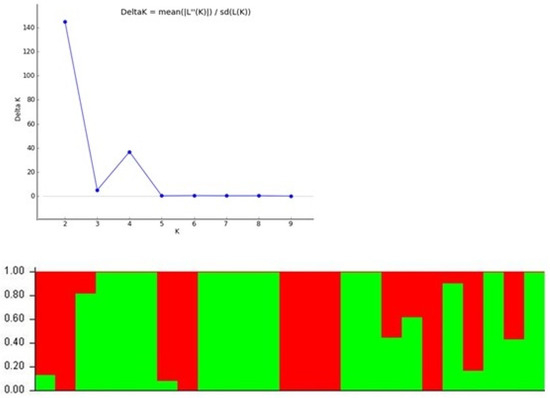 Population structure analysis of 25 Vigna accessions based on 200 SSR markers (K = 2) and graph of estimated membership fraction for K = 2. (Red: Sub-population 1 and Green: Sub-population 2).
