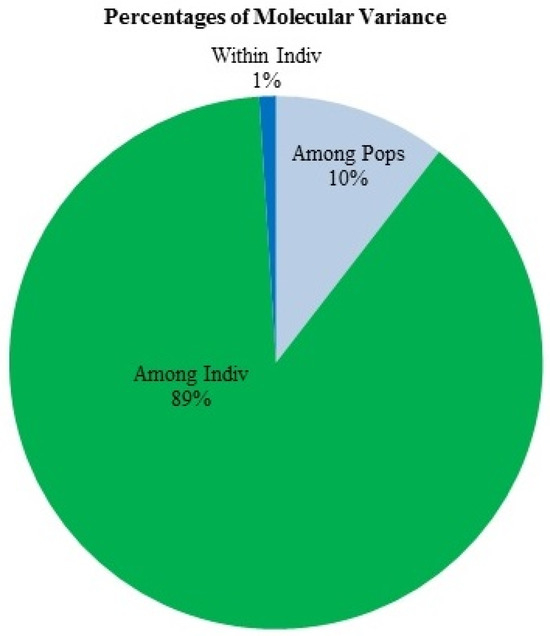 The AMOVA provides clues regarding the genetic variation present within and among individuals. The greater variance of 89% among individuals revealed the presence of high genetic diversity. The low genetic diversity among populations indicates the exchange of germplasm between different regions and the distribution of similar Vigna species [56,73,78]. Among populations, a low level of genetic diversity of 10% was observed in our study, while Geeta Kumari et al. [73] obtained a high level of genetic diversity of 88.33% among populations. In the case of oil-tea Camellia species, 77% genetic variation was observed within the population, whereas there was a small fraction of genetic variation among species (23%) [85]. Fst is an estimate of population differentiation on account of genetic composition. Frankham et al. [86] stated that an Fst estimate < 0.15 is an important criterion for population discrimination. The obtained Fst value of 0.105 is near the significant value, indicating low differentiation between individuals. The results of principal coordinate analysis (PCoA) and UPGMA-based clustering were in agreement, showing gene diversity and the clear differentiation of cultivated and wild Vigna species. Similarly, 140 oil-tea Camellia species accessions were divided into three groups based on the PCoA and UPGMA analysis [85].
