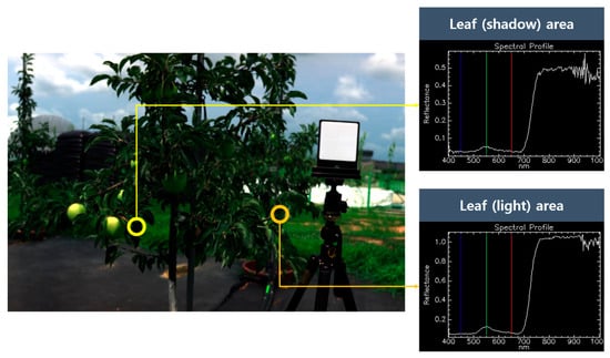 As depicted in Figure 2, in shadowed regions, where light absorption and reflection are minimal, noise occurs. When comparing spectral curves between areas with shadows and those without, reflectance values exhibit a difference of approximately 0.1 to 0.5 or more depending on the wavelength. Since such differences can lead to data errors in predicting nitrogen content, histograms were generated for each wavelength. Subsequently, threshold values were set to minimize the impact of shadows and delineate the regions. To reduce the spectral resolution of the extracted hyperspectral data, the original 2-binning images were partitioned into 4-binning, 8-binning, and 16-binning.