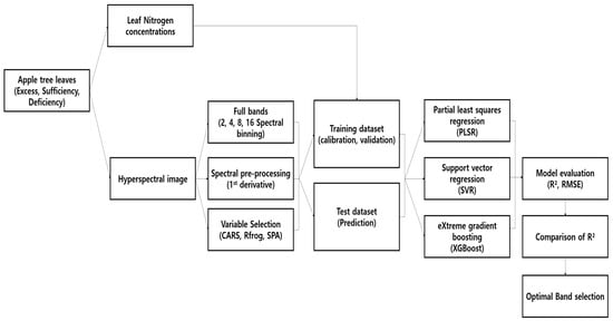Flowchart for estimating the apple leaf nitrogen concentration using hyperspectral imaging.