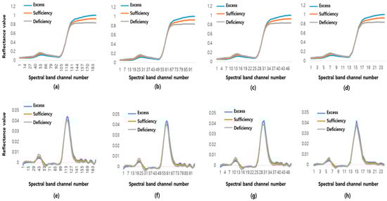 Reflectance curves (raw, 1st derivative) of the apple leaves, obtained via hyperspectral imaging based on 2 (a,e), 4 (b,f), 8 (c,g), and 16 (d,h) binning.