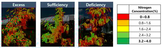 Figure 5 presents the mapping of hyperspectral images using the wavelengths selected based on CARS. The results are divided into red to green colors based on the nitrogen content range, indicating that the leaf nitrogen content ranged from a minimum of 0% to a maximum of 4%. Spectral binning, which combines wavelength bands, can reduce the number of wavelength bands and lead to the loss of continuous spectral data, potentially degrading the performance of the prediction models [41]. However, this process can also reduce the costs associated with data processing and analysis. Additionally, by combining adjacent wavelength bands, the SNR can be enhanced, and the inclusion of similar spectral data can be minimized. Therefore, appropriate spectral binning may offer advantages such as a reduced data processing speed owing to a reduction in high-dimensional spectral data and enhanced predictive performance [42,43,44].