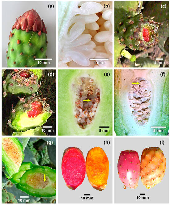 Developmental stages in fruits with a positive response to parthenocarpy induction: (a) Bud in pre-anthesis stage (15 days); (b) unfertilized ovules; (c,d) flower buds after the styles with their stigmas, stamens, and tepals were excised, in which the growth regulator mixture was applied; pulp development on the empty integuments (RS): (e–g); Parthenocarpic fruits (tunas) of CP-30 Red (h) and CP-40 Yellow (i). The yellow arrows indicate seminal residues with pulp production.