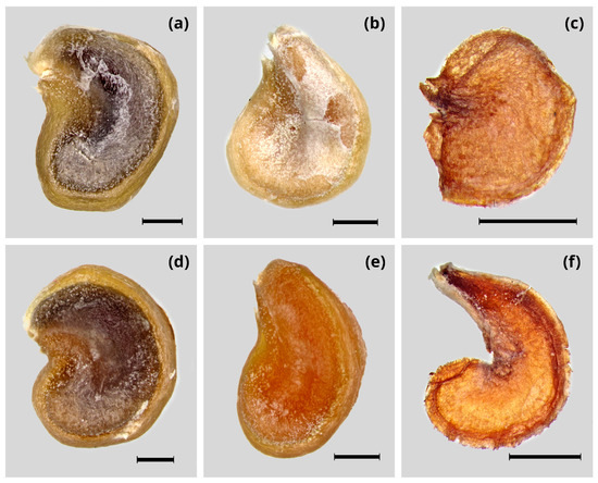 Normal seeds (a,d), abortive seeds (b,e), of open-pollinated fruits, and seminal residues (c,f), of parthenocarpic fruits CP-30 Red, above, and CP-40 Yellow, below. Scales: 1 mm.